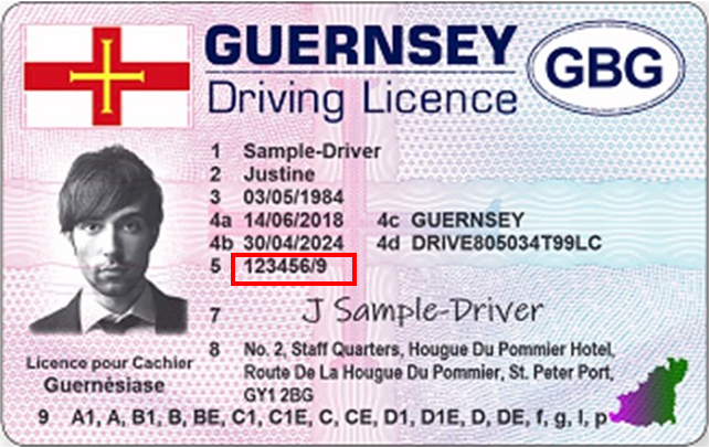 Your Guernsey Driving Licence number can be found on your Guernsey Driving Licence card and on the paper counter-part. There is a numbered list to the right of your photo, the licence number is shown next to 5. We only need the first part up to the forward slash (/). For example, if your licence number is 120345/6, enter 120345.